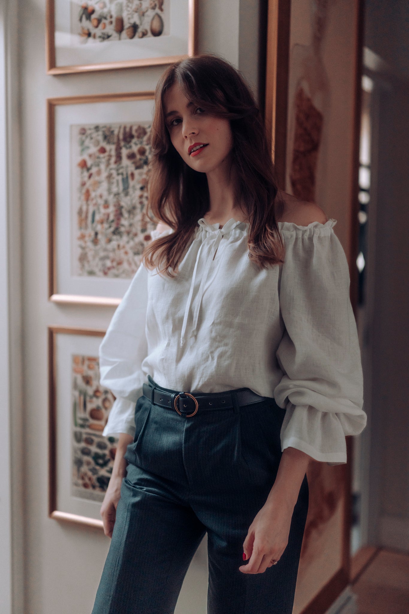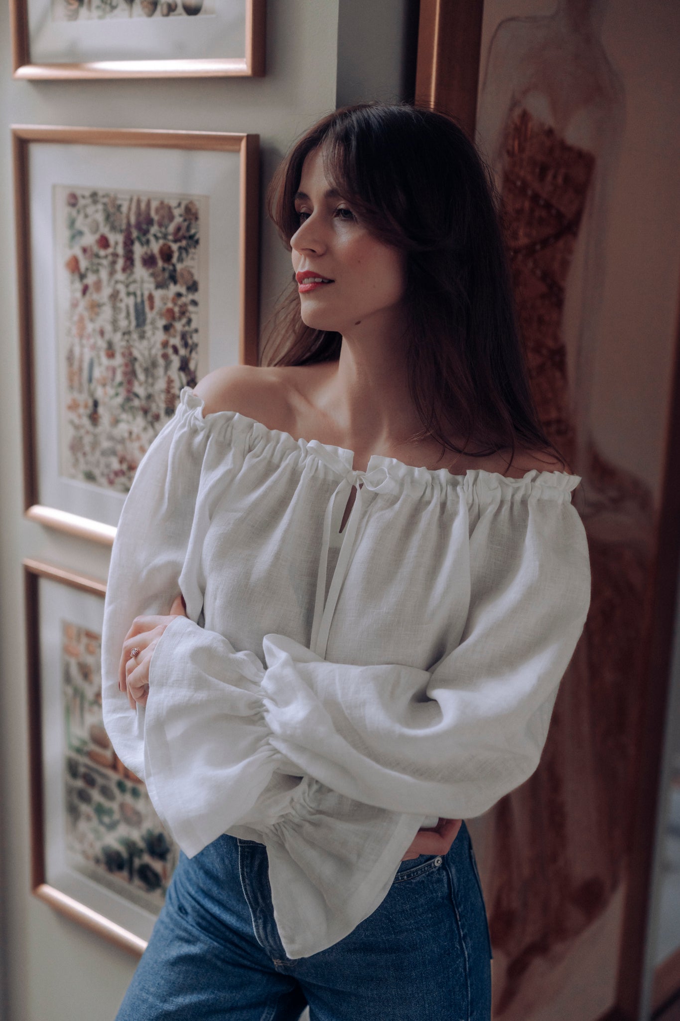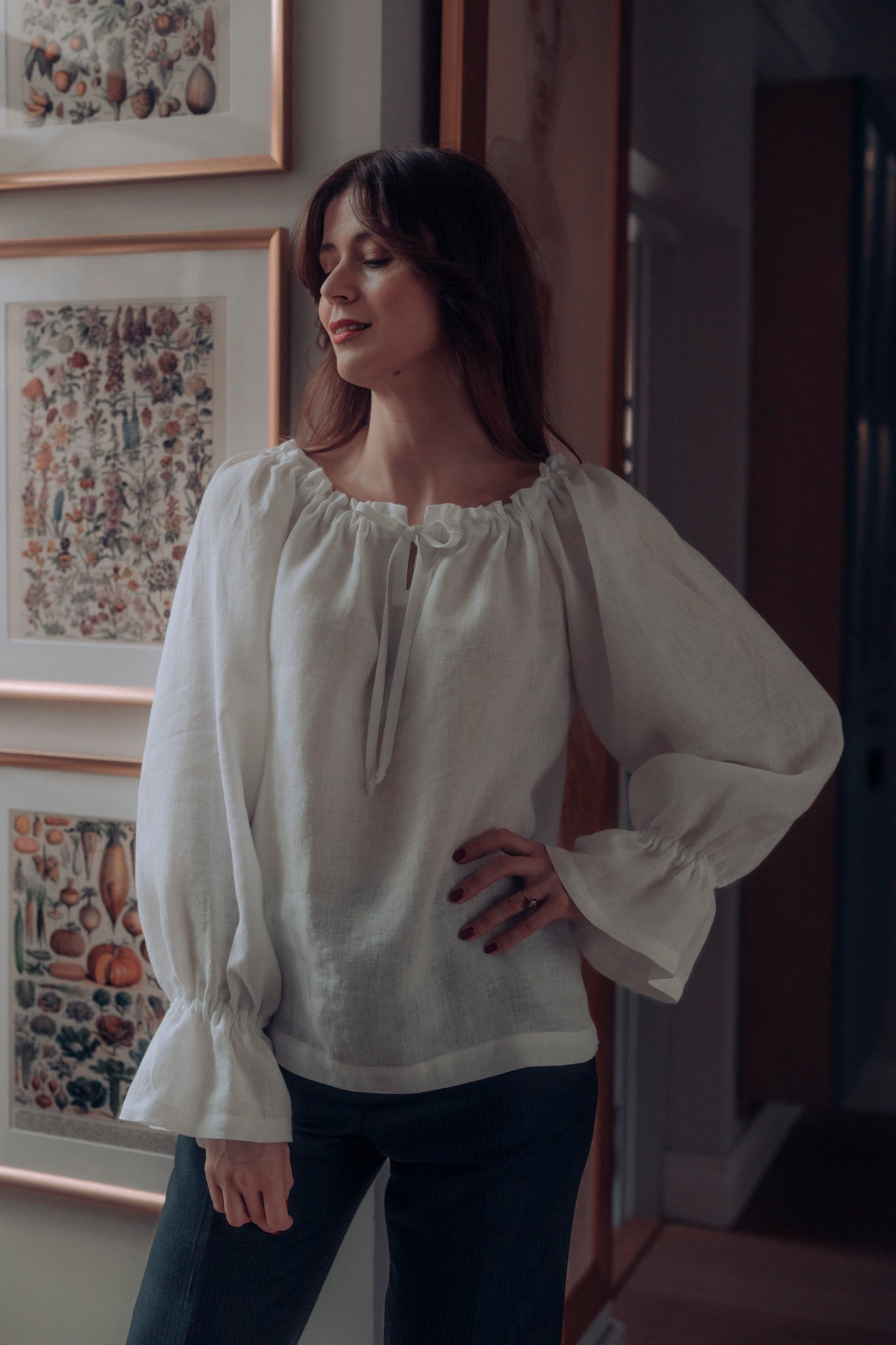 The Celine blouse captures the quiet romance of Haapsalu. Think soft light, sea breeze, and the ease of linen against the skin. Handcrafted in our ateliers, it is a study in timeless femininity: airy puffed sleeves, a gathered neckline that gently frames the shoulders, and a silhouette that feels both effortless and refined.